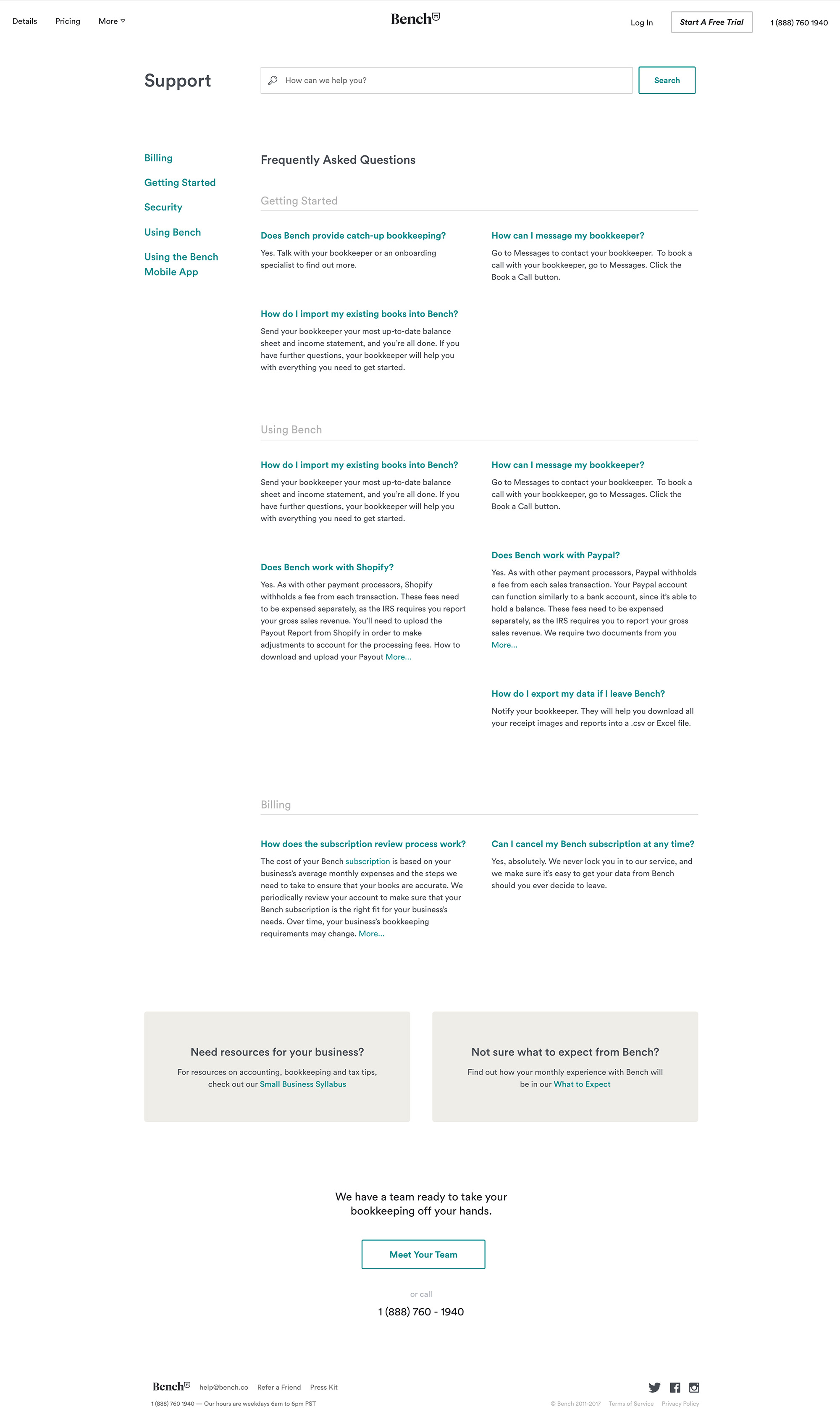 One of my biggest projects at Bench was to redesign and develop the Support Centre in Wordpress. I worked closely with the Art Director to ensure that the design was on brand. The idea for the new Support Centre was keeping things minimal. This guarantees the user to find specific help articles with ease.