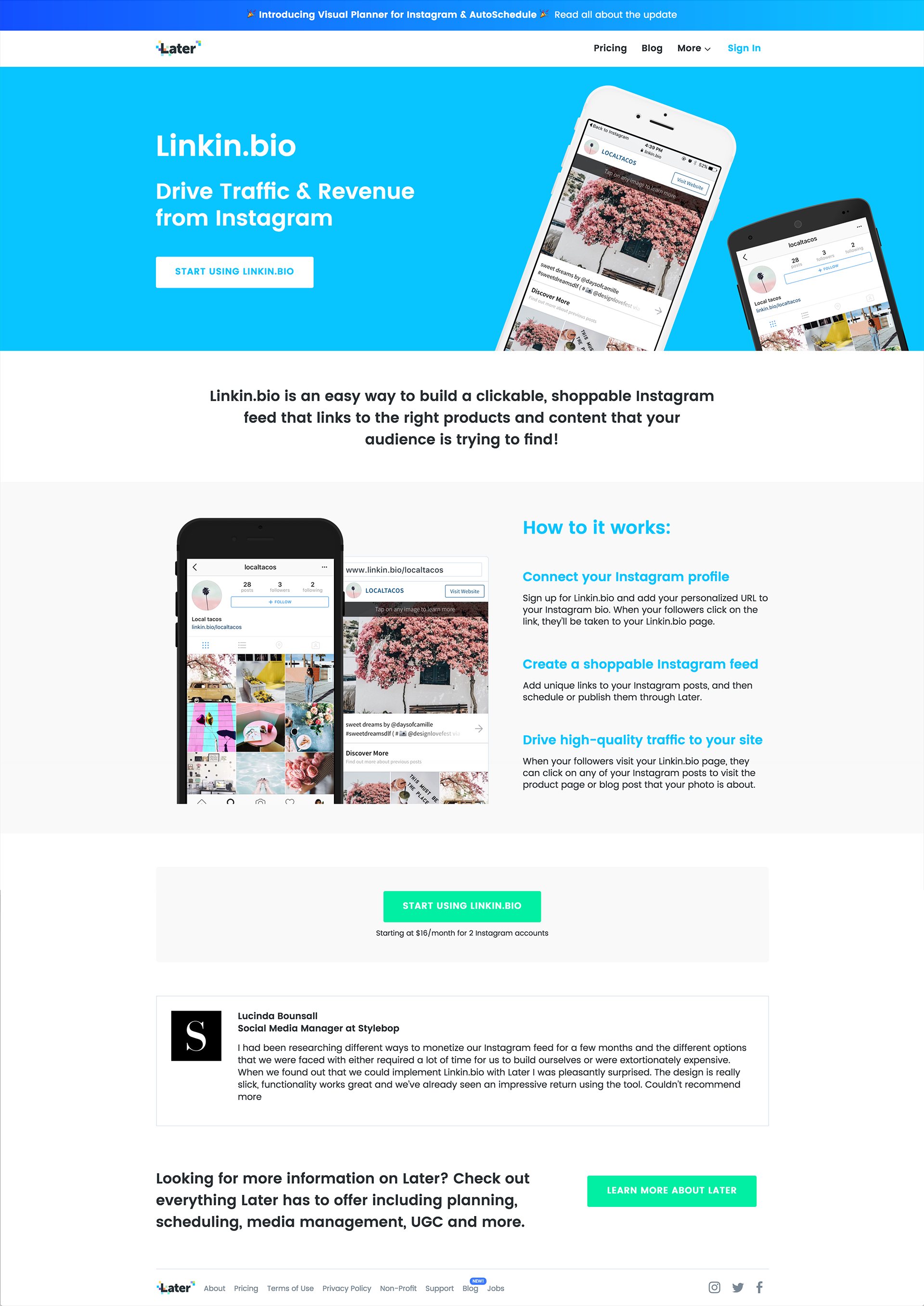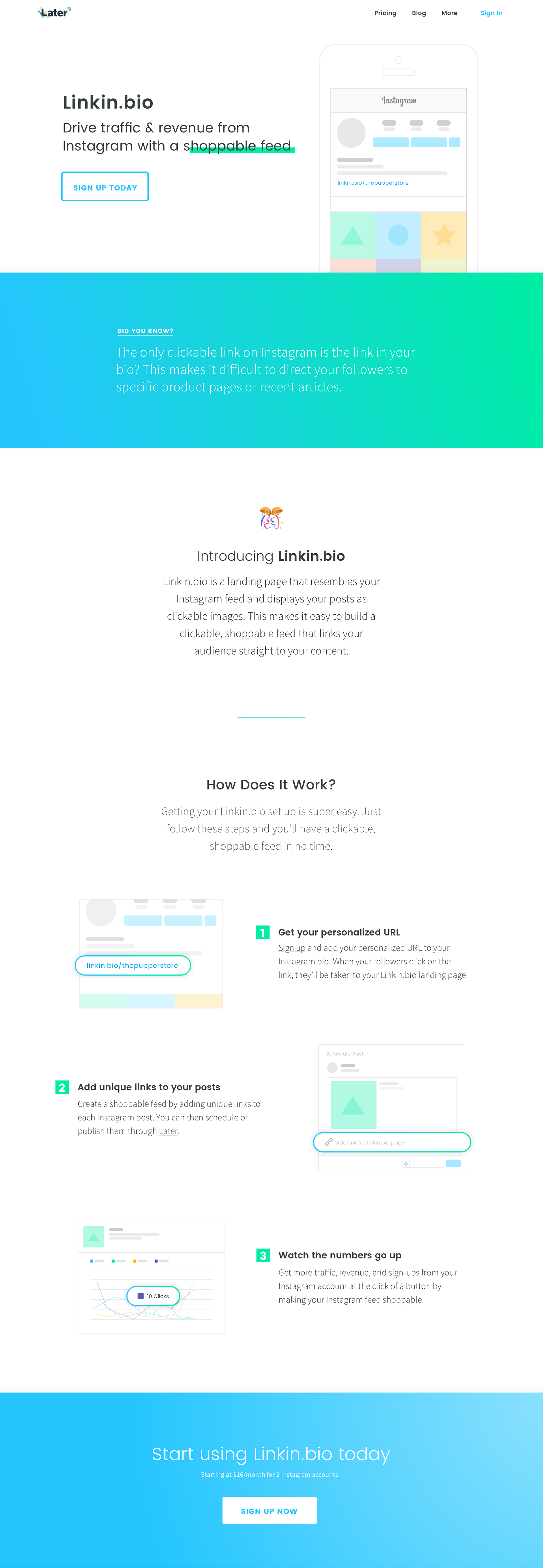 Later is a marketing platform for scheduling and organizing Instagram posts. Because Instagram did not allow links in their feed, Later created Linkin.bio as a solution around that. Linkin.bio creates a landing page that replicates your current Instagram feed to give you the ability to link out your posts.